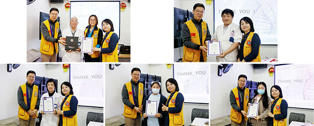 ▲ 中國(guó)獅子聯(lián)會(huì)浙江代表處糖尿病預(yù)防項(xiàng)目委員會(huì)負(fù)責(zé)人頒發(fā)紀(jì)念品及志愿服務(wù)證書