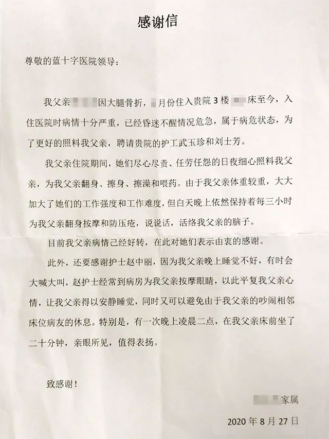 我父親住院期間,她們盡心盡責(zé)、任勞任怨的(地)日夜細(xì)心照顧我父親,為我父親翻身、擦身、擦澡。由于我父親體重較重,大大加大了她們的工作強(qiáng)度和工作難度,但白天晚上毅然保持著每三小時為我父親翻身按摩和防壓瘡,說說話,活絡(luò)我父親的腦子。