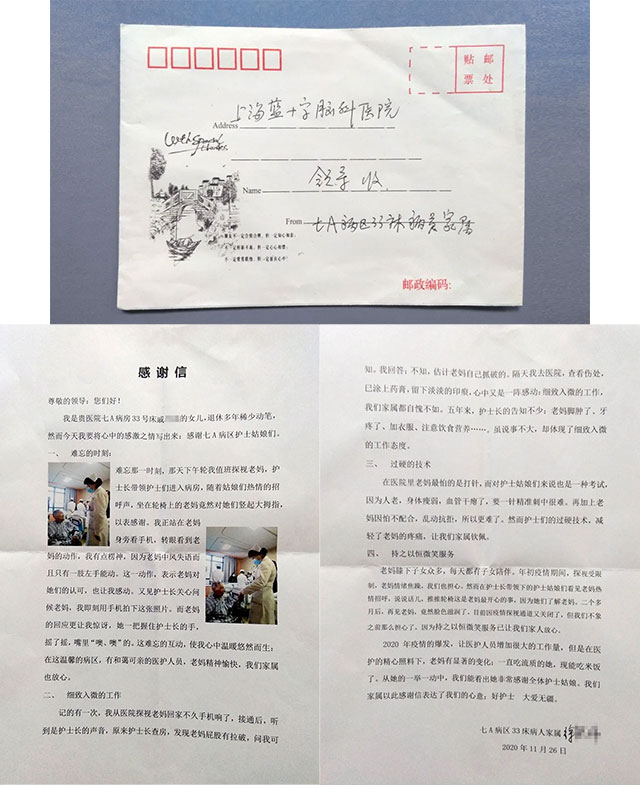 11月26日,上海藍(lán)十字腦科醫(yī)院神經(jīng)內(nèi)科7A病區(qū)護(hù)士站收到了一封來自33床患者戚阿婆女兒徐女士的感謝信,她要特別感謝李楠楠護(hù)士長及其帶領(lǐng)的7A護(hù)士團(tuán)隊(duì),是護(hù)士們的默默守護(hù)與悉心護(hù)理才有了其母親今日的神采和康健。
