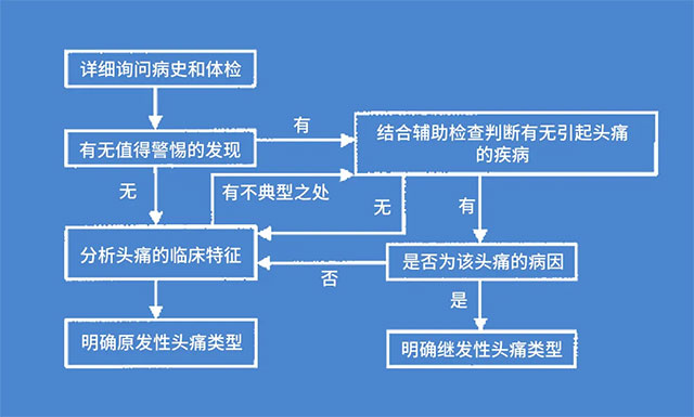 在頭痛的診斷過程中,應(yīng)首先區(qū)分是原發(fā)性或是繼發(fā)性。原發(fā)性頭痛多為良性病程,繼發(fā)性頭痛則為器質(zhì)性病變所致,任何原發(fā)性頭痛的診斷應(yīng)建立在排除繼發(fā)性頭痛的基礎(chǔ)之上。