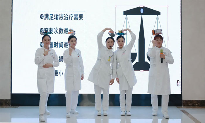 小鋼針擅長(zhǎng)‘閃電戰(zhàn)’;留置針是負(fù)責(zé)“短期陣地戰(zhàn)”的;PICC/CVC是負(fù)責(zé)“中長(zhǎng)期戰(zhàn)役”的;輸液港則是負(fù)責(zé)“持久戰(zhàn)”和“特種作戰(zhàn)”的……選擇何種置管方式,需要根據(jù)患者的治療時(shí)間、藥液性質(zhì)、血管條件、生活需求和經(jīng)濟(jì)情況來(lái)綜合決定。黃朵朵護(hù)士長(zhǎng)帶領(lǐng)著靜療小組成員錢世平、蔡先杰、劉文、張雨晴、裴育,通過(guò)精心設(shè)計(jì)的卡通形象和活潑的語(yǔ)言,結(jié)合豐富的圖片、生動(dòng)的視頻及真實(shí)貼切的案例,將專業(yè)性很強(qiáng)的靜療護(hù)理知識(shí),演繹得生動(dòng)形象、惟妙惟肖。
