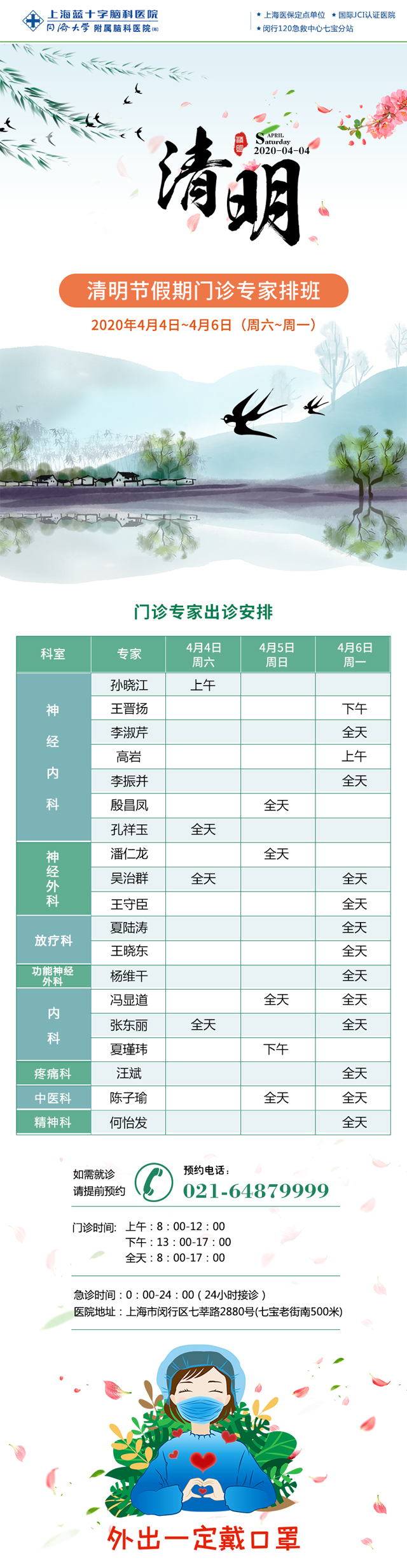 2020年清明節(jié)假期將至,我院為方便患者節(jié)假日期間就診,4月4日(周六)—4月6日(周一)我院門診照常開放,各檢查項目照常開放。具體門診安排如下所示: