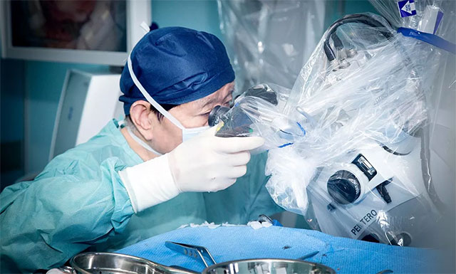 ▲ 通過蔡司顯微鏡(雙熒光),沈教授為患者手術(shù)
