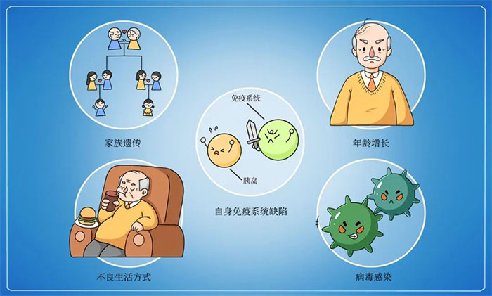 糖尿病是由于胰島素分泌不足及(或)作用缺陷引起的以血糖升高為特征的代謝病。主要誘因?yàn)?strong>遺傳因素、病毒感染、肥胖、精神因素等導(dǎo)致的自身免疫功能障礙。