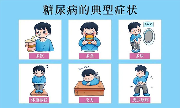 糖尿病的典型癥狀是“三多一少”(多飲、多食、多尿、體重減輕)。