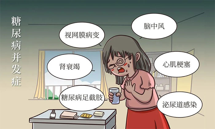 糖尿病被稱為“不死的癌癥”,糖尿病患者常伴有脂肪、蛋白質(zhì)代謝異常。長期高血糖可引起多種器官,尤其是眼、心、血管、腎、神經(jīng)損害或器官功能不全或衰竭,導(dǎo)致殘廢,甚至過早夭亡。糖尿病常見并發(fā)癥包括卒中、心肌梗死、視網(wǎng)膜病變、糖尿病腎病、糖尿病足等。具體危害表現(xiàn)為:
