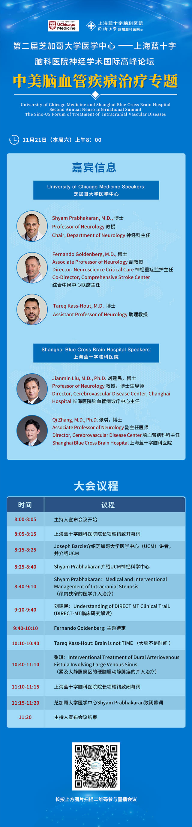 11月21日(本周六)上午8:00,第二屆芝加哥大學醫(yī)學中心—上海藍十字腦科醫(yī)院神經(jīng)學術(shù)國際高峰論壇將隆重召開。在疫情防控新形勢下,本次大會采用線上+線下相結(jié)合的形式,在上海藍十字腦科醫(yī)院設(shè)置線上主會場。芝加哥大學醫(yī)學中心和上海藍十字腦科醫(yī)院的專家們跨越地域限制,共同參與到這次學術(shù)盛會。
