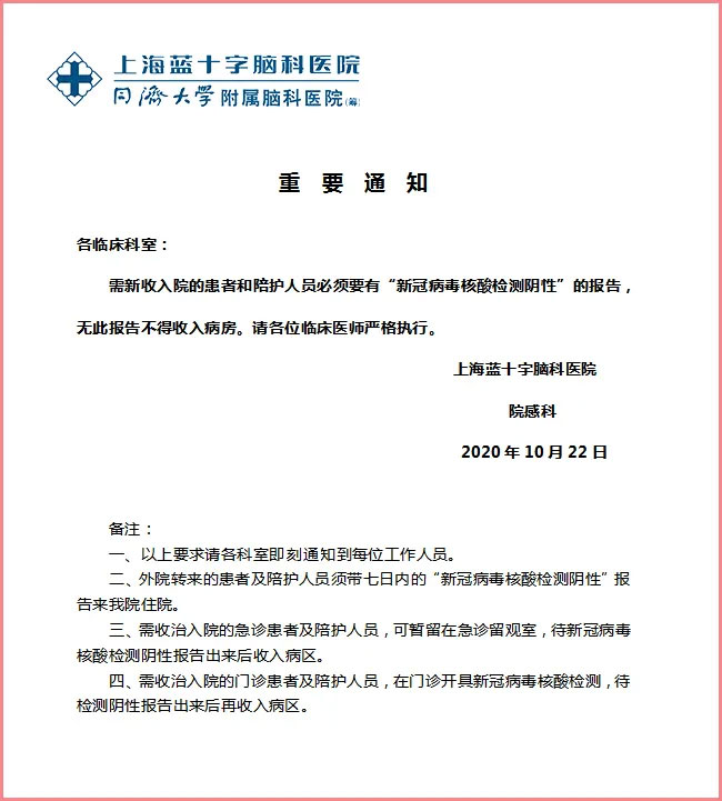 ▲ 10月22日公布的關于收入院患者及陪護人員須核酸檢測的重要通知