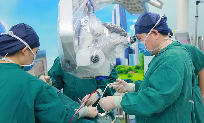 術(shù)中,在蔡司顯微鏡(雙熒光)下,見淡紅色腫物,質(zhì)軟,與周圍垂體邊界較清楚。李士其教授在充分保護(hù)好海綿竇、頸內(nèi)動脈、視神經(jīng)等結(jié)構(gòu)前提下,在錯綜復(fù)雜的神經(jīng)血管狹窄間隙中,逐步分塊切除腫物,仔細(xì)刮除,直至順利完成手術(shù)。
