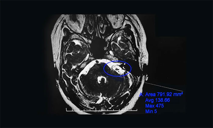 為進(jìn)一步治療,劉阿姨在家人陪伴下慕名求醫(yī)上海藍(lán)十字腦科醫(yī)院。入院后,楊忠旭教授團(tuán)隊(duì)認(rèn)真評(píng)估了劉阿姨面肌痙攣發(fā)生的頻率、強(qiáng)度和持續(xù)時(shí)間,并完善了核磁顱神經(jīng)檢查。面神經(jīng)MRTA+增強(qiáng)顯示:左側(cè)面神經(jīng)與周圍小血管關(guān)系密切。
