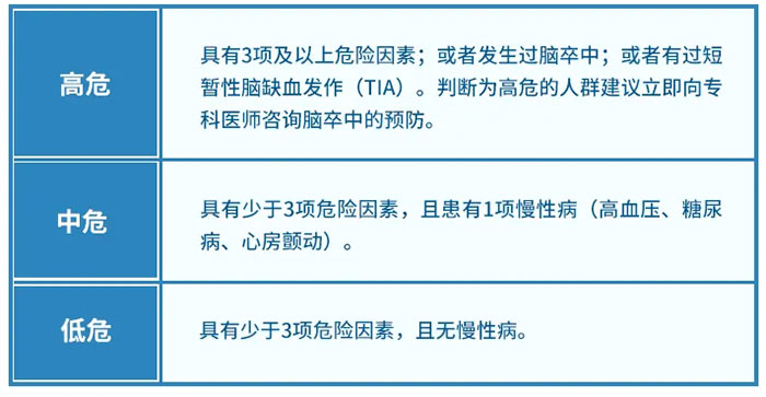 其中,“8”是指高血壓、血脂異常、糖尿病、吸煙、心房顫動(dòng)、超重或肥胖、缺乏運(yùn)動(dòng)、腦卒中家族史8項(xiàng)腦卒中主要危險(xiǎn)因素;“2”是指發(fā)生過腦卒中或者有過短暫性腦缺血發(fā)作(TIA),并將危險(xiǎn)人群劃分為高危、中危、低危三個(gè)類別。